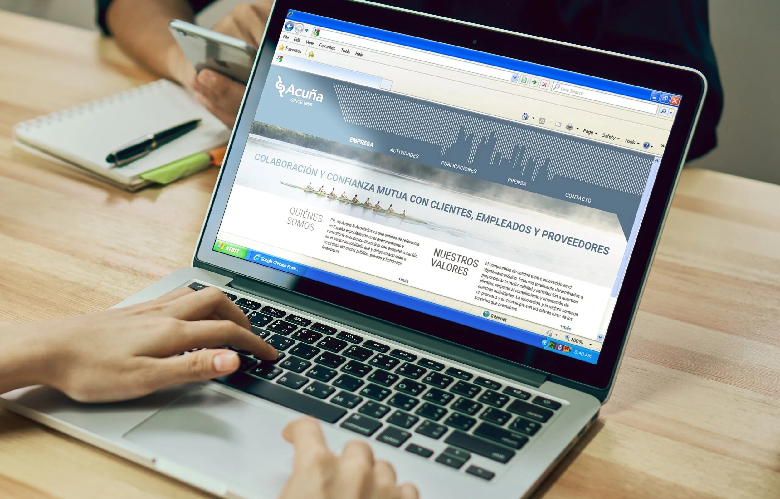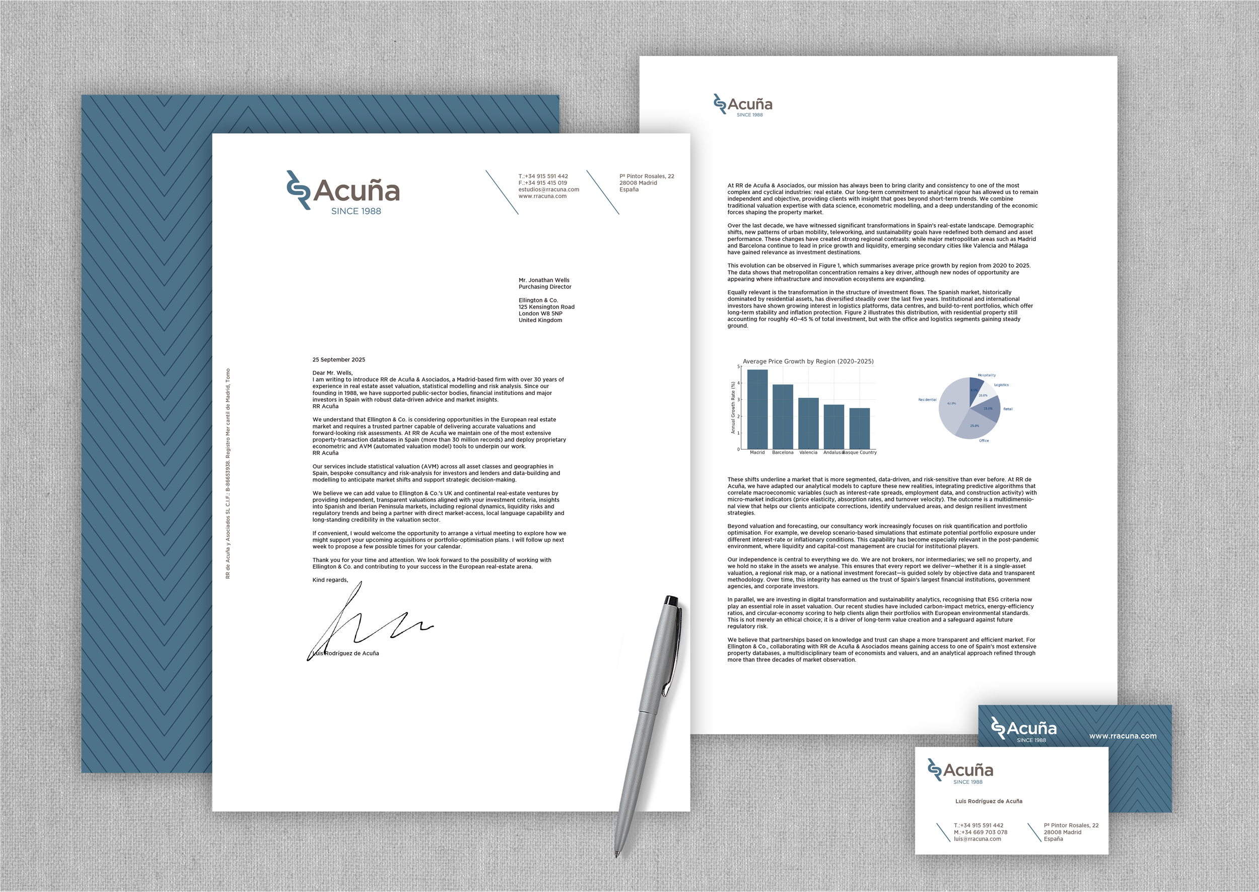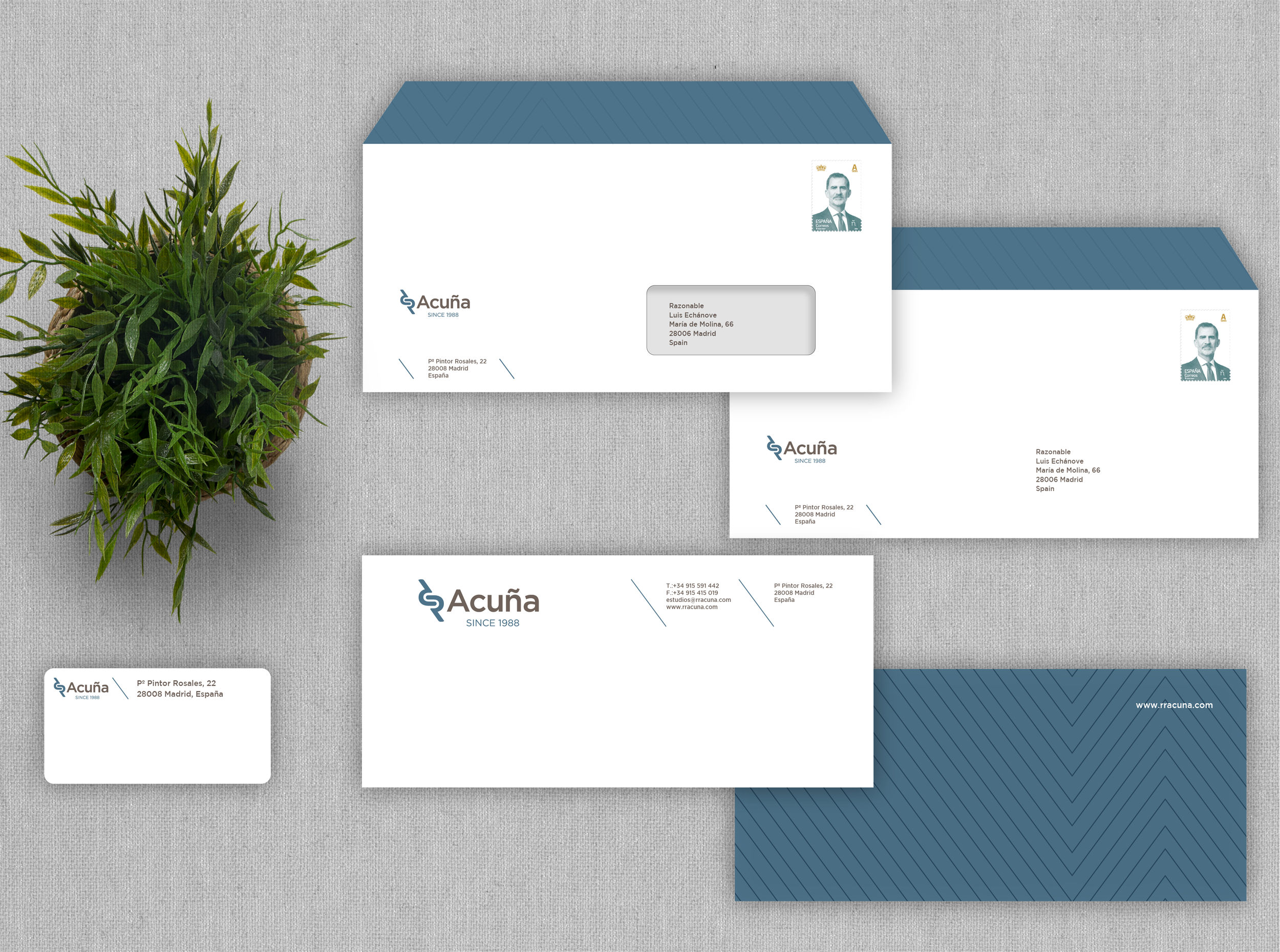 As the company celebrated its 30th anniversary in the market, it was the ideal occasion to update its visual identity, adapting it to the new times and technologies prevailing in the sector in which it operates. The result is a total renovation that ranges from the commercial name, which changes from "RR de Acuña y Asociados" to a simpler and more forceful "Acuña", to the design of a new logo, color palette, graphic resources and their corresponding applications, both online and offline.