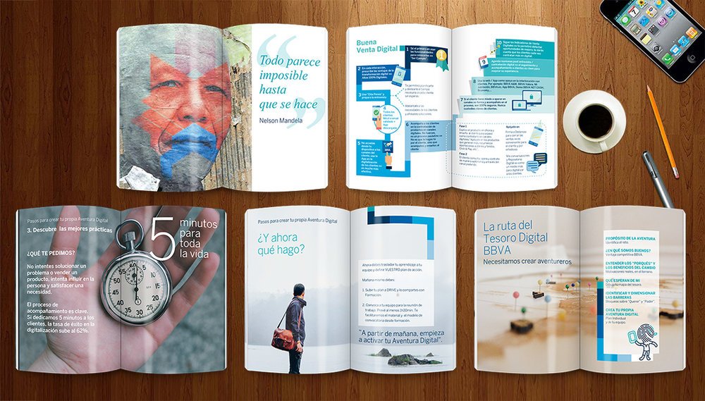 When a large bank like BBVA needs to convey the need to face the digital challenge to its employees, it develops tools aimed at facilitating their training in this new challenge. In Razonable we have participated in this project with the design of the documentation used in this training.